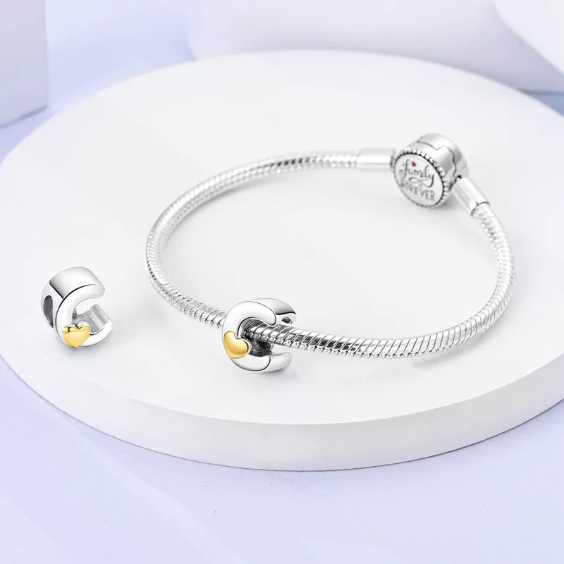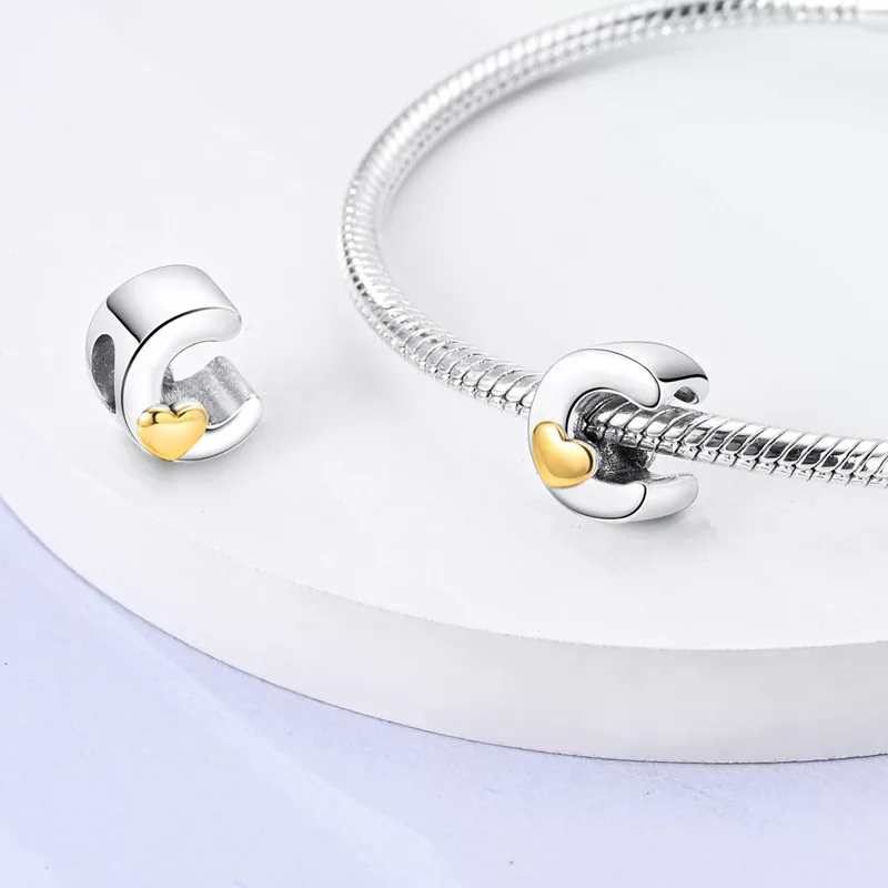 A charm különlegessége a letisztult, fényes ezüst felületen megcsillanó, apró arany színű szív motívum. Ez a finom kontraszt melegséget és romantikus bájt kölcsönöz az ékszernek, így bármilyen összeállítást különlegessé tesz. Legyen szó egy fontos alkalomról vagy a mindennapok ragyogásáról, ez a darab a minimalista elegancia jegyében született.