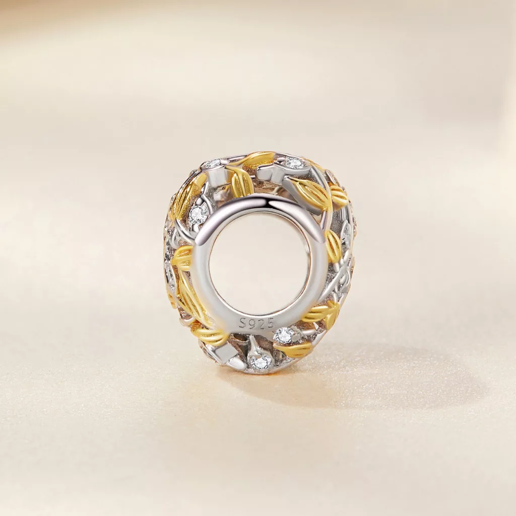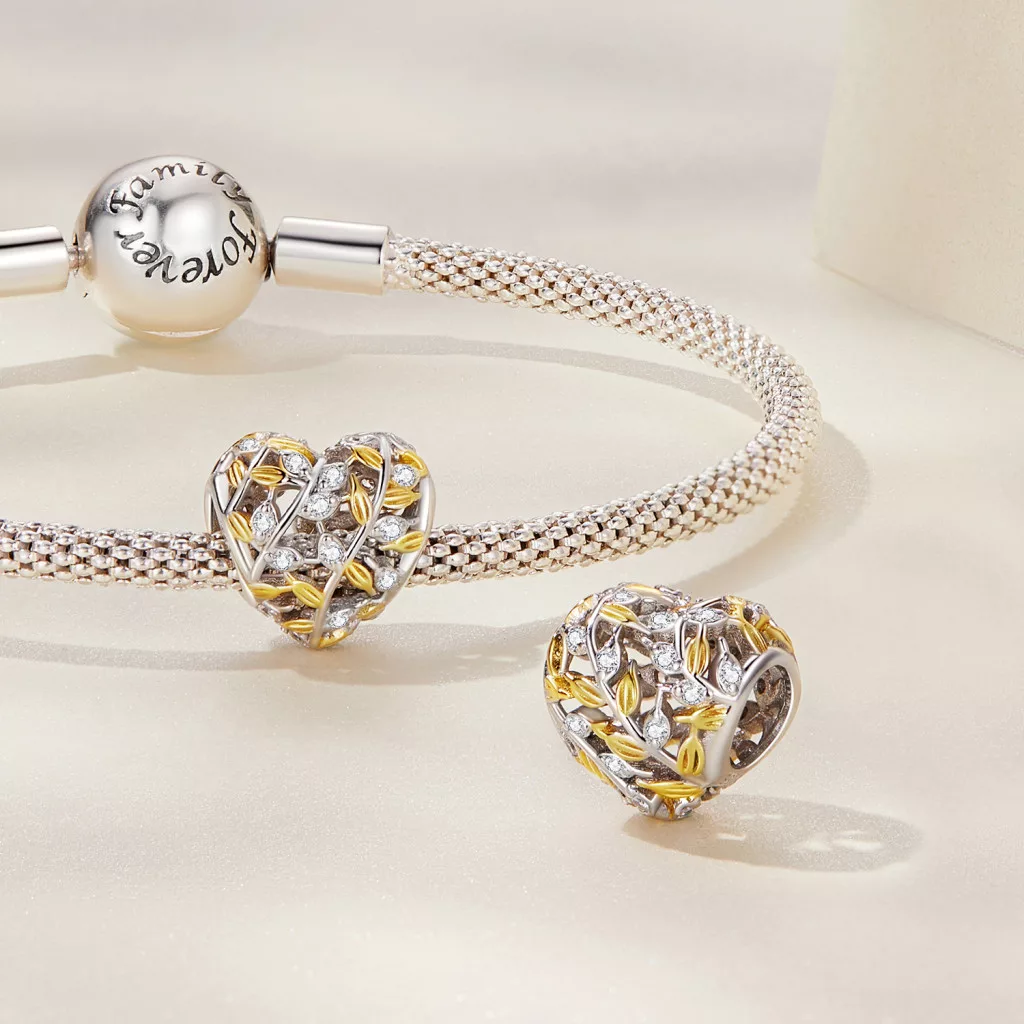 A charmot finoman kidolgozott, egymásba kapcsolódó ezüst levelek alkotják, amelyek együtt formáznak egy tökéletes szív alakot. A hűvös ezüst levelek között megbújik egyetlen, meleg rózsaarany bevonattal ellátott levél, amely kiemelkedik a többi közül, és a charm fókuszpontjává válik. Ez az egyedi levél jelképezheti azt az egyetlen, különleges személyt, emléket vagy érzést, amely bearanyozza az életedet.