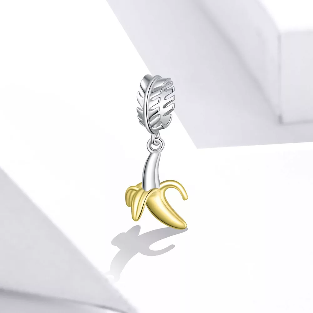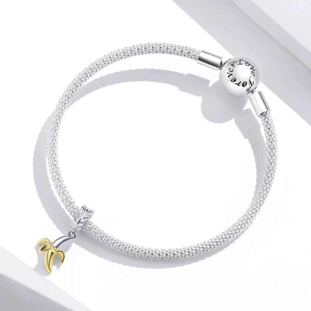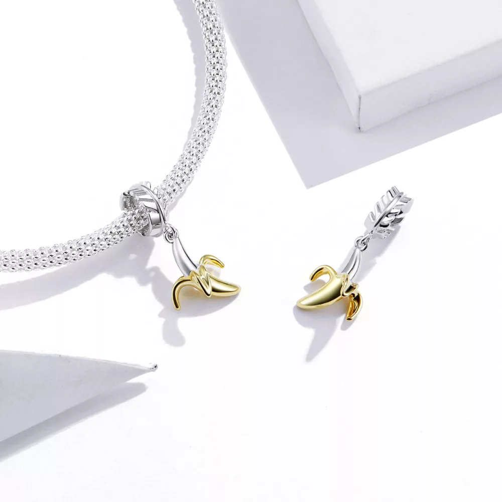 A charm minden apró részlete precízen megmunkált: a banán jellegzetes formája, a finom vonalak és a belső részletesség egyedülállóan élethűvé teszi ezt a darabot. Az ezüst fényes csillogása és a banán formája garantáltan figyelemfelkeltő és különleges kiegészítőt biztosít számodra. A függő kialakítás lehetővé teszi, hogy a charm szabadon mozogjon a karkötődön vagy nyakláncodon, ezzel dinamikus és játékos elemet adva az ékszeredhez.