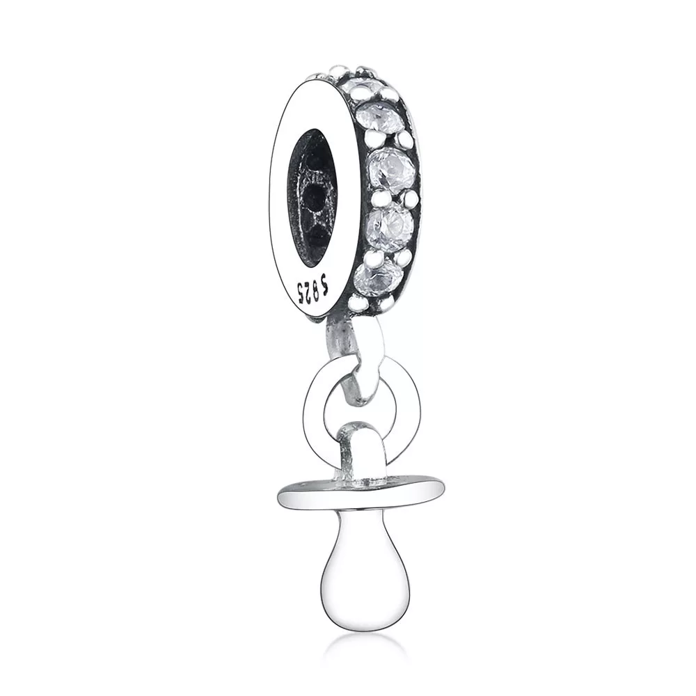 A charm központi motívuma egy apró, részletesen kidolgozott cumi, amely hűen visszaadja ennek az ikonikus tárgynak a formáját. A cumi felső része finoman ívelt, míg az alsó részén a kerek gomb könnyed eleganciát sugároz. Ez a charm tökéletesen megtestesíti a gyermekkor ártatlanságát és a szülői szeretet mély érzelmeit.
