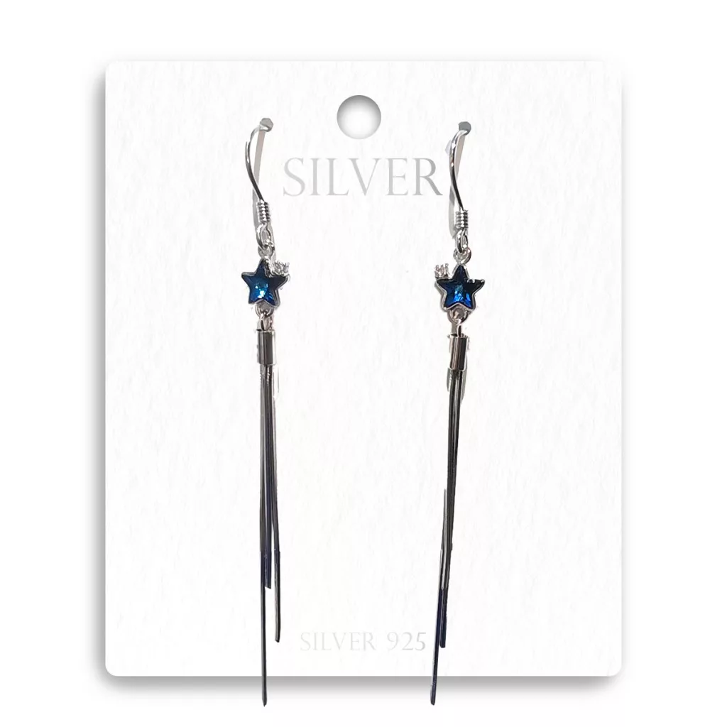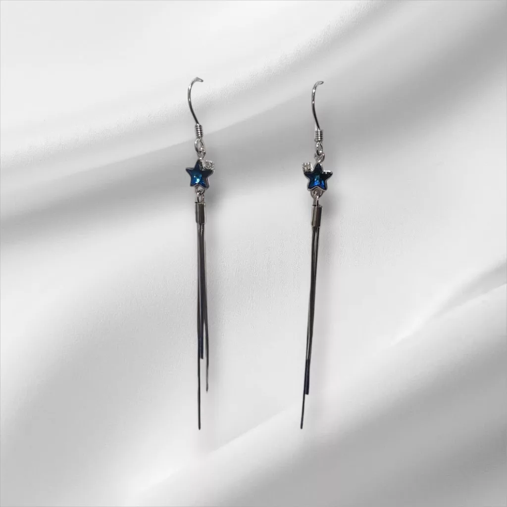 Varázsold el környezeted az "Éjféli Csillag Zuhogó" ezüst fülbevalóval, amely a csillagos égbolt misztikumát hozza el viseletedbe. Ez a légies és elegáns ékszer egy apró, mélykék, csillag alakú kővel indul, amelyből finom, sötétített ezüst szálak omlanak alá, egy modern és kifinomult rojtos hatást keltve. A fülbevaló minden mozdulatnál finoman követi viselőjét, sejtelmes csillogást kölcsönözve.