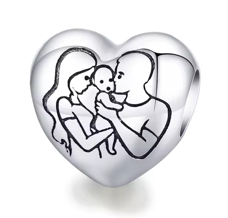 Örökítsd meg az élet legszebb és legtisztább pillanatát ezzel a megható, szív alakú ezüst charmmal! A medál finoman kidolgozott grafikája egy újdonsült családot ábrázol: az édesanyát és az édesapát, amint szeretetteljesen közrefogják és köszöntik gyermeküket. Ez az ékszer nem csupán egy dísz, hanem a szülői szeretet, a gondoskodás és az új élet kezdetének gyönyörű szimbóluma.