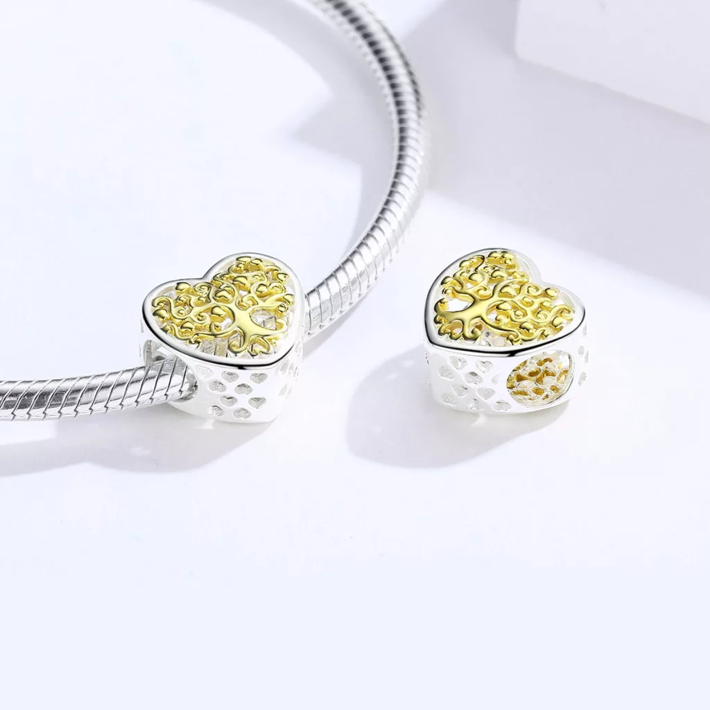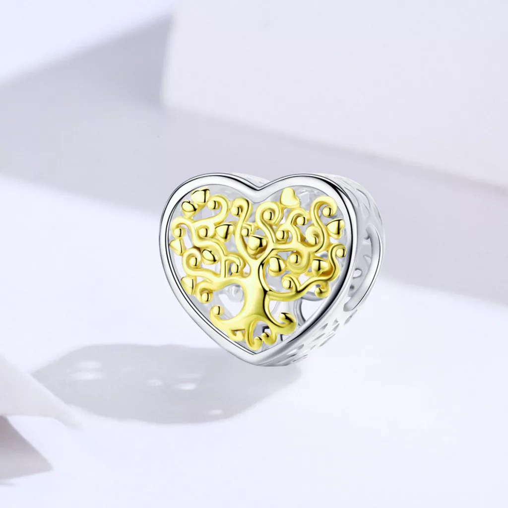 A család, az erő és a növekedés szimbóluma most a legszebb formában, egy szív alakú ezüst charmon! Ez az ékszer egy gyengéd emlékeztető az élet legfontosabb kötelékeire. A charm alapja egy szív forma, amelynek közepében az élet fájának gazdagon ábrázolt motívuma látható. A fa lombkoronáját apró, ragyogó, beültetett kövek alkotják, melyek aranyozott (plated gold) bevonatot kaptak az extra fény és melegség érdekében. A szív külső pereme sima, magas fényű ezüst, amely gyönyörűen keretezi a fa részletgazdag arany tónusú motívumát.