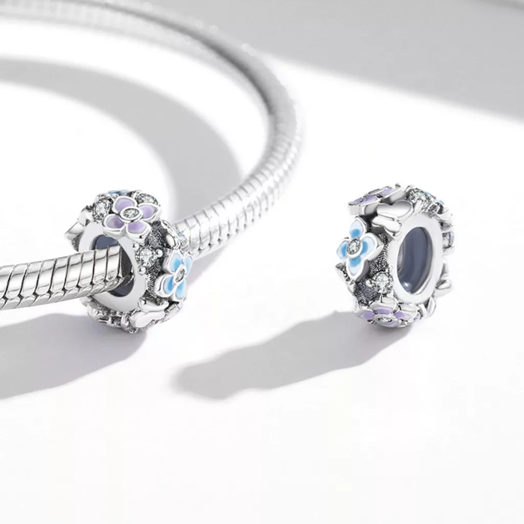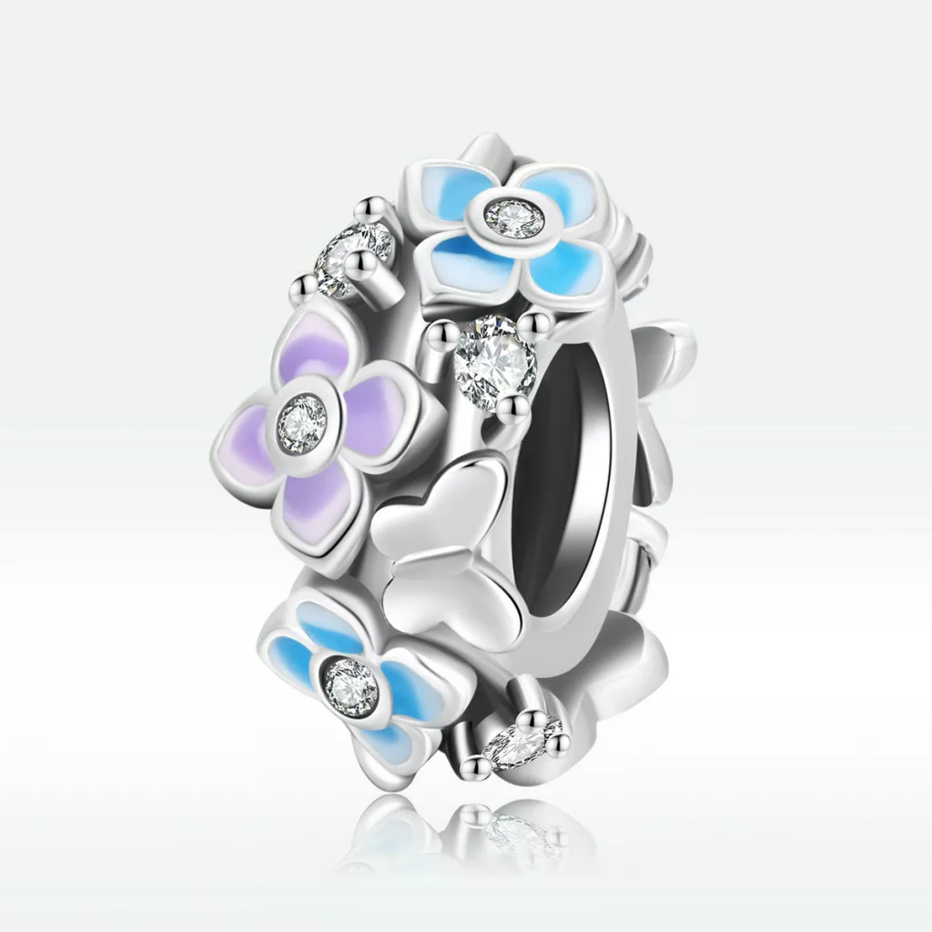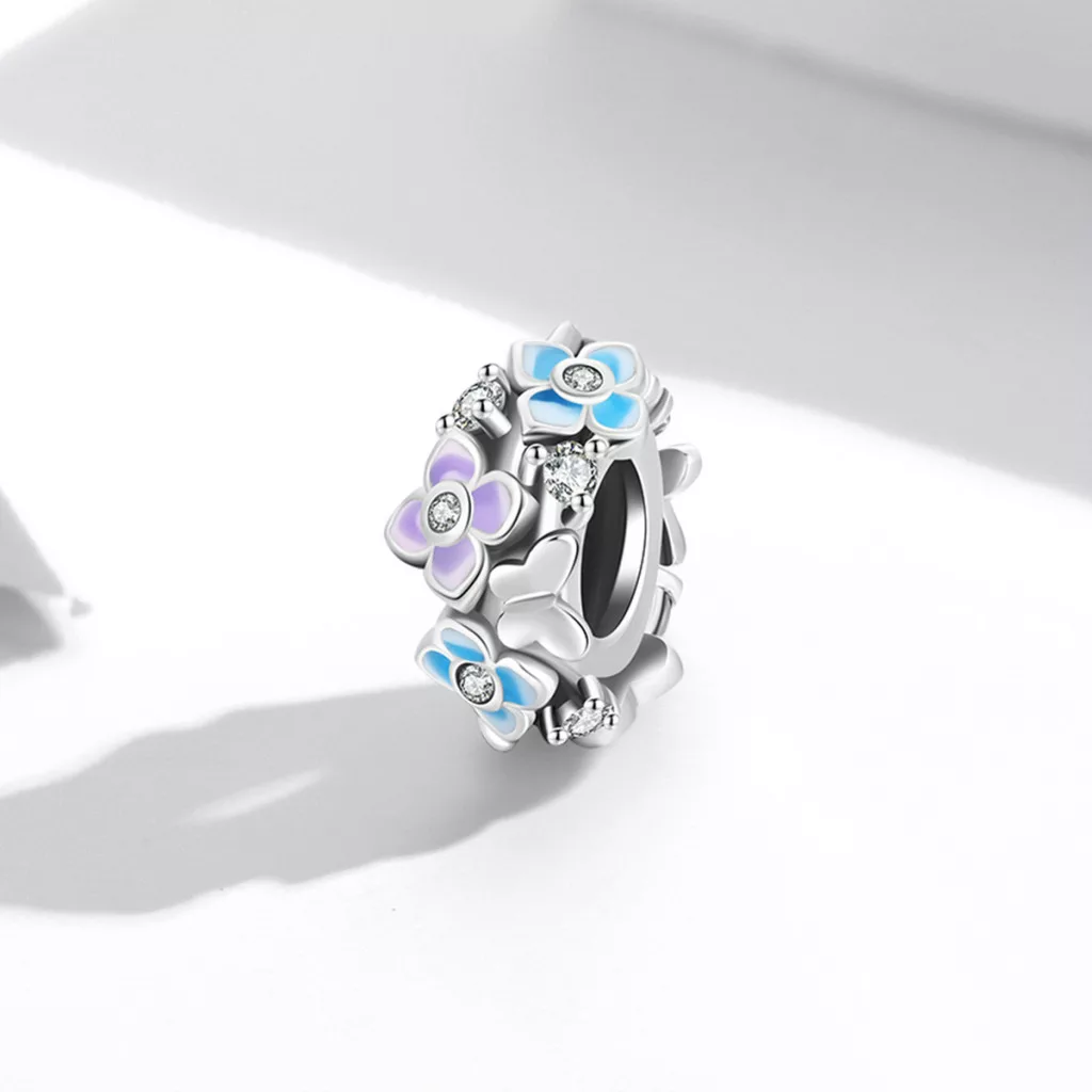 Hozd el a tavasz frissességét és színes báját a karkötődre ezzel a finom, virágokkal díszített ezüst charm medállal! Ez az apró ékszer a természet megújulását és az élet szépségét ünnepli. A charm egy klasszikus, henger alakú kialakítású ezüst alapra épül, melynek felületét körben apró, finoman kidolgozott virágok borítják. A virágok színes enamel (zománc) díszítést kaptak halvány lila és kék árnyalatokban. Ez a finom virágos charm ideális választás a Pandora Moments karkötődhöz.