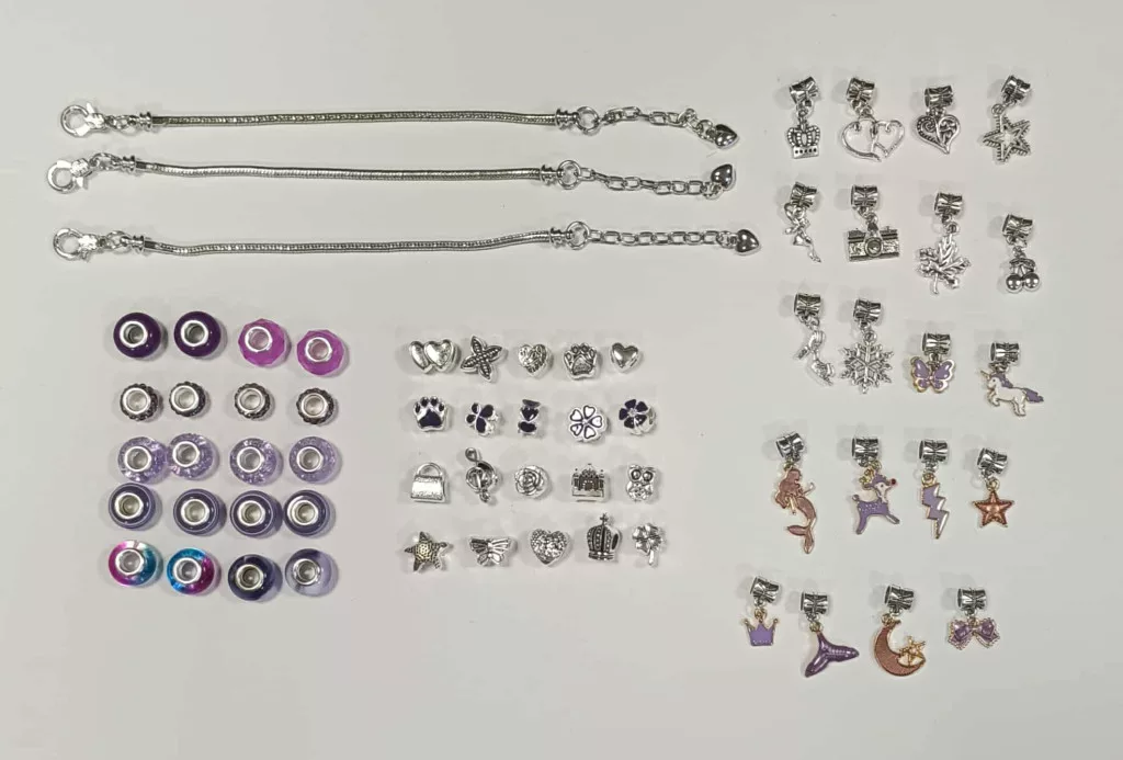 A készletben található fém elemek, charmok és medálok kiváló minőségű rozsdamentes acélból (nemesacél) készültek. Ez az anyagválasztás biztosítja, hogy az ékszerek tartósak legyenek, ne színeződjenek el, és bírják a mindennapi játékot és viselést.