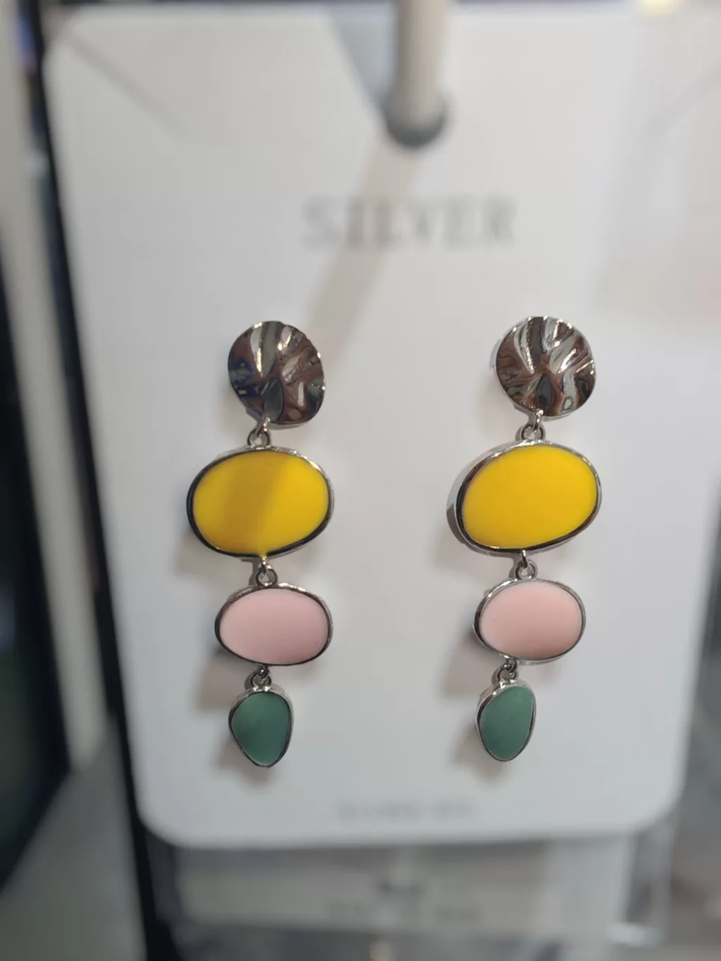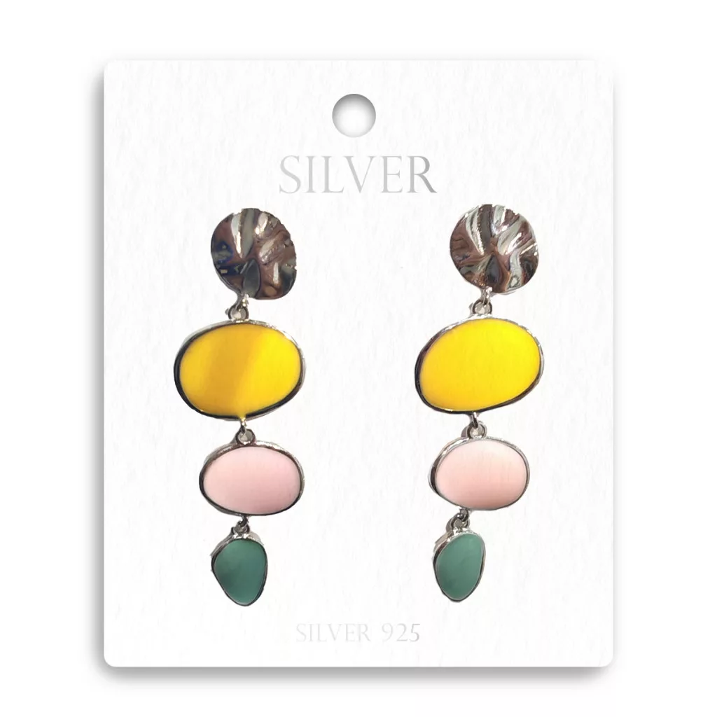 Hozd el a tavasz frissességét és a nyár játékosságát a "Pasztell Kavicsok" ezüst fülbevalóval! Ez a vidám és modern ékszer tökéletes választás azoknak, akik szeretik a színeket és az egyedi formákat. A fülbevaló egy finoman texturált ezüst koronggal indul, amelyről három, különböző pasztellszínű – napsárga, babarózsaszín és tengerzöld – organikus formájú elem lóg alá, egyedi és harmonikus kompozíciót alkotva.