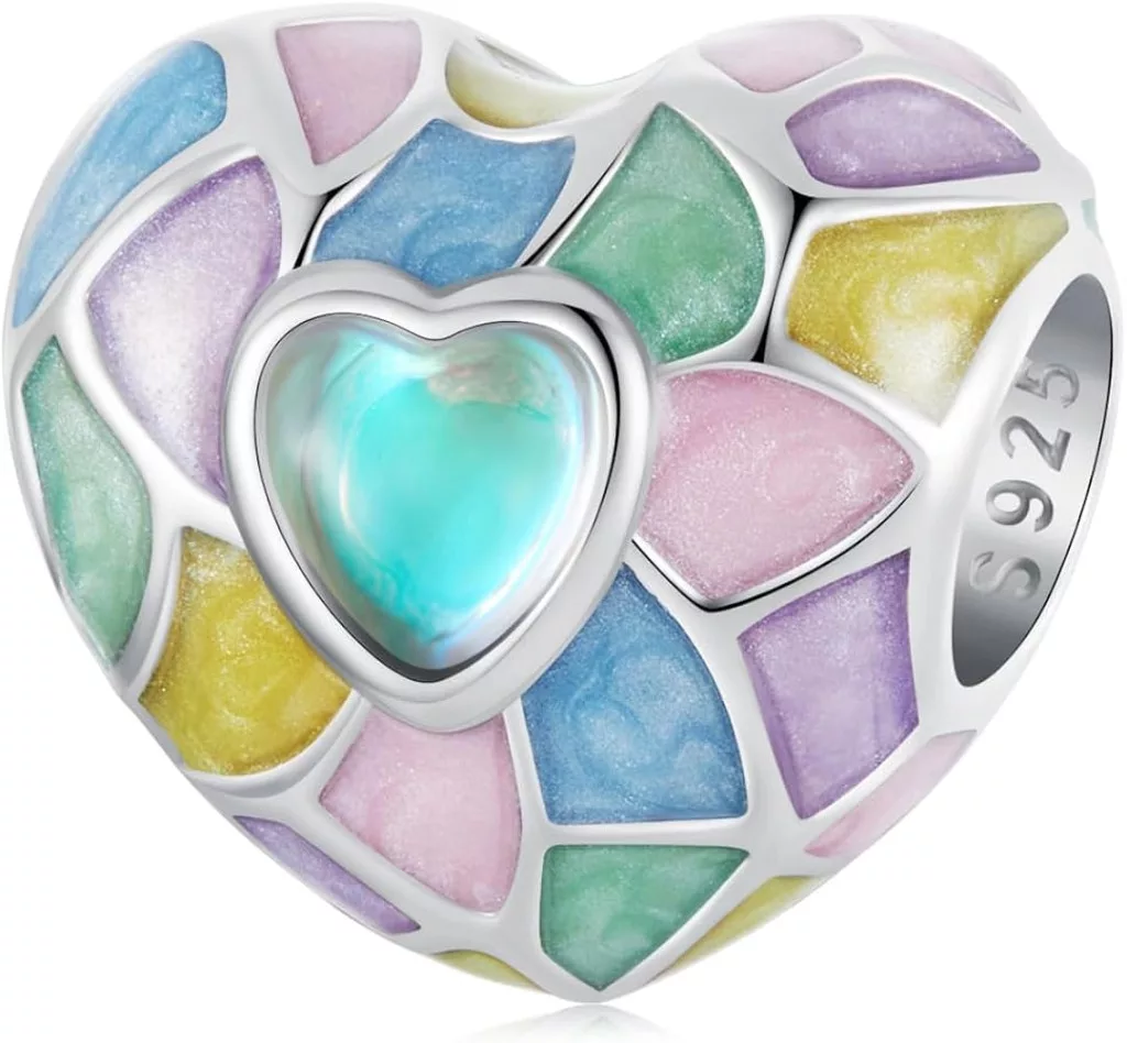A szív alakú charmot finom ezüst vonalak osztják apró szegmensekre, melyeket pasztell rózsaszín, halványsárga, mentazöld és babakék színek töltenek ki, egyedi mozaikot alkotva. A dizájn középpontjában egy titokzatosan fénylő, irizáló szív alakú kő ragyog, amely minden szögből más árnyalatot mutat, azonnal rabul ejtve a tekintetet.