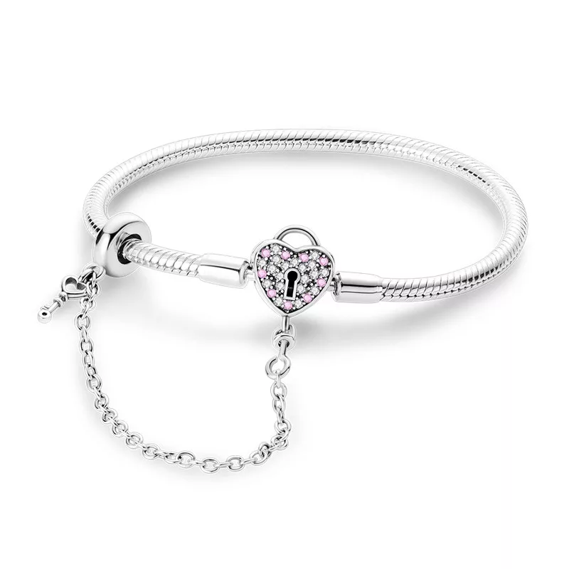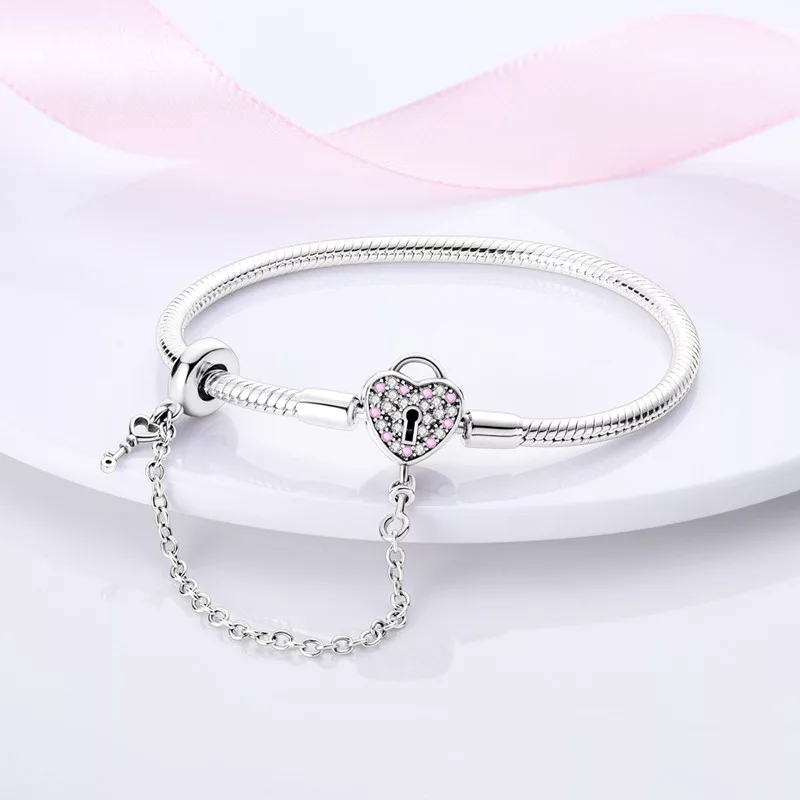 Pink Szíves Lakat Ezüst Karkötő - 17 cm