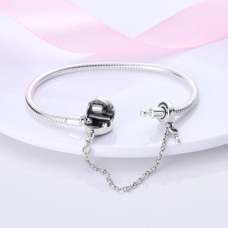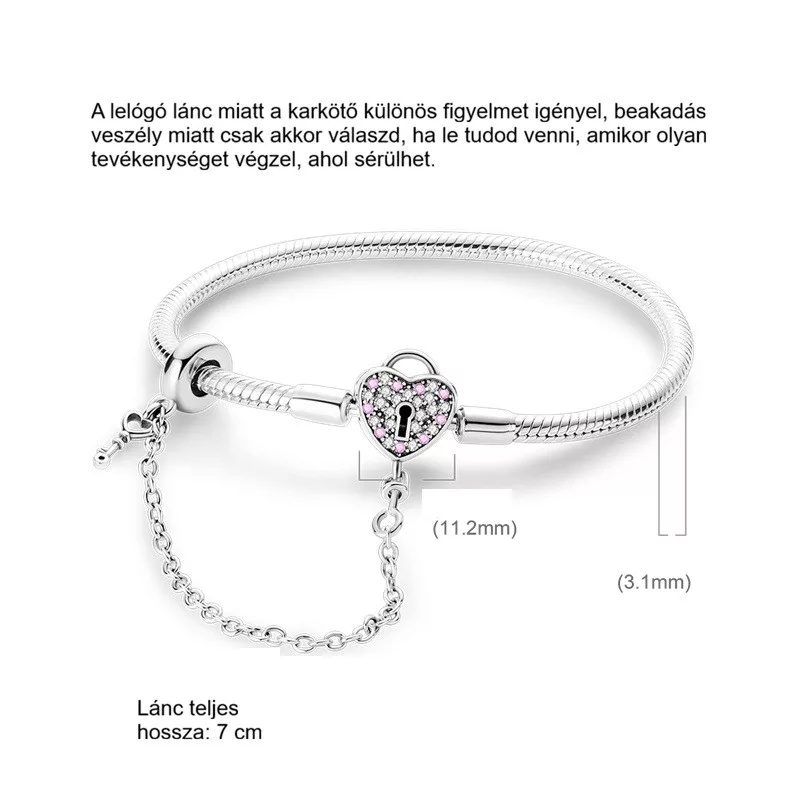 Ez a romantikus, 17 cm-es ezüst karkötő a stílus és a védelem tökéletes találkozása. A központi eleme egy gyönyörű, pink kövekkel díszített szív alakú lakat, melyet egy finom biztonsági lánc egészít ki, megóvva ékszeredet az esetleges lecsúszástól. Kompatibilis a Pandora Moments charmokkal. Fontos figyelmeztetés köves charmok esetén: Kérjük, vedd figyelembe, hogy a kövekkel díszített charmok extrán sérülékenyek. A kövek kiesésének leggyakoribb oka a fizikai behatás. Ha a charm hozzáütődik valamihez, például az asztalhoz, az ajtófélfához vagy akár egy másik ékszerhez, a kő meglazulhat és kieshet. Kérjük, óvd és kíméld minden fizikai behatástól, hogy sokáig gyönyörködhess ragyogásában. Fontos megjegyezni, hogy a garancia nem vonatkozik a kövek kiesésére, ha az fizikai behatás következménye.