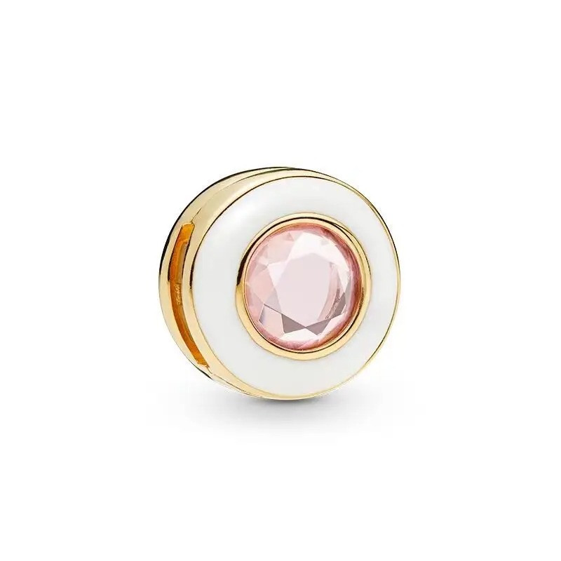 A klasszikus elegancia és a modern vonalvezetés tökéletes fúziója kel életre ebben a kifinomult, arany színű ezüst charmban. A design középpontjában egy fazettált, halványrózsaszín kristály ragyog, melynek finom csillogását egy makulátlan, hófehér tűzzománc gyűrű emeli ki.