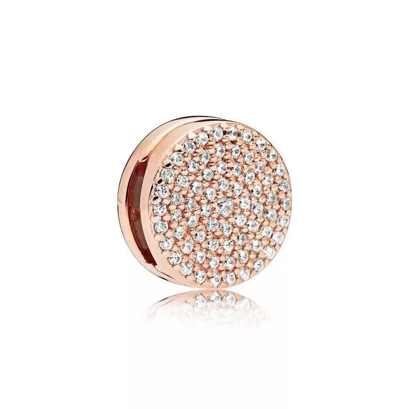 A korong alakú charm felületét sűrűn kirakott, apró, víztiszta kövek díszítik, amelyek minden apró mozdulatnál megragadják és visszaverik a fényt. A lágy rozé árnyalat és a kövek ragyogása tökéletes egyensúlyt teremt a modern minimalizmus és a klasszikus csillogás között.