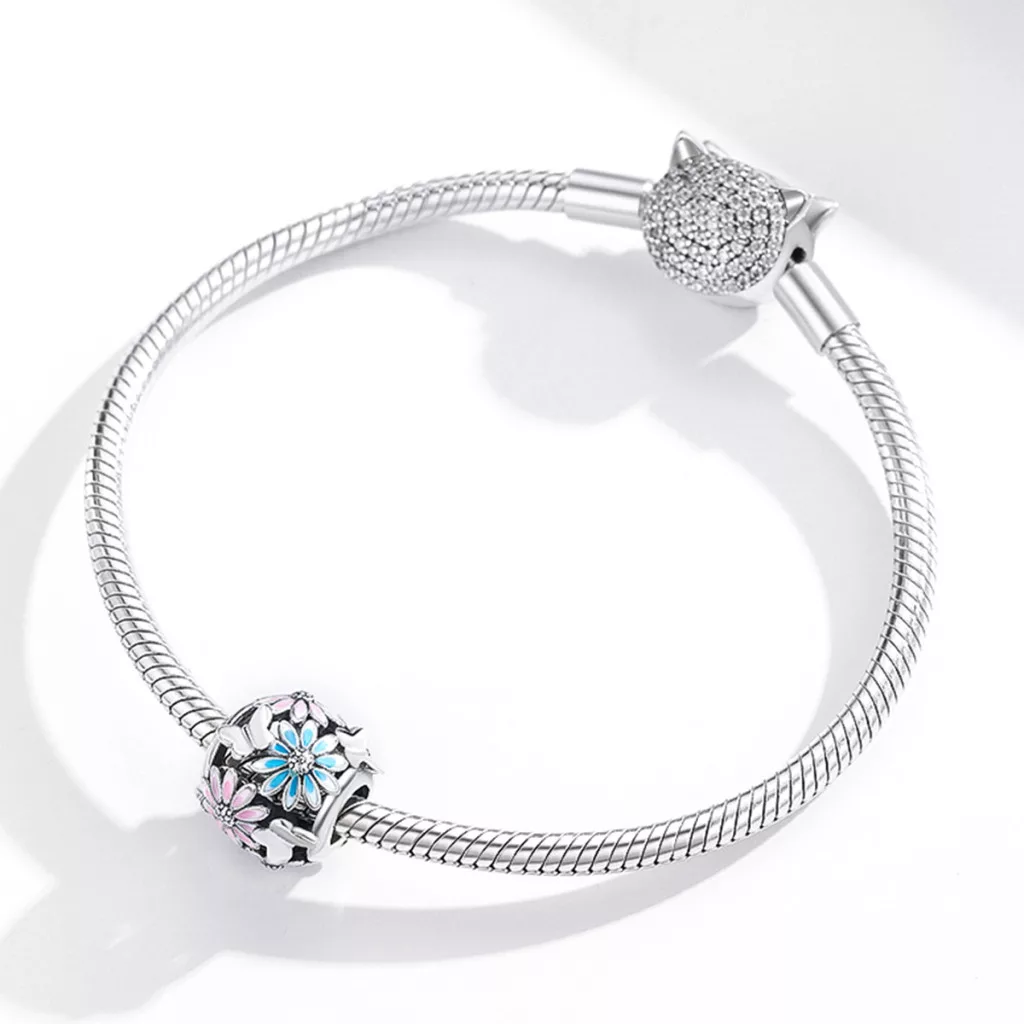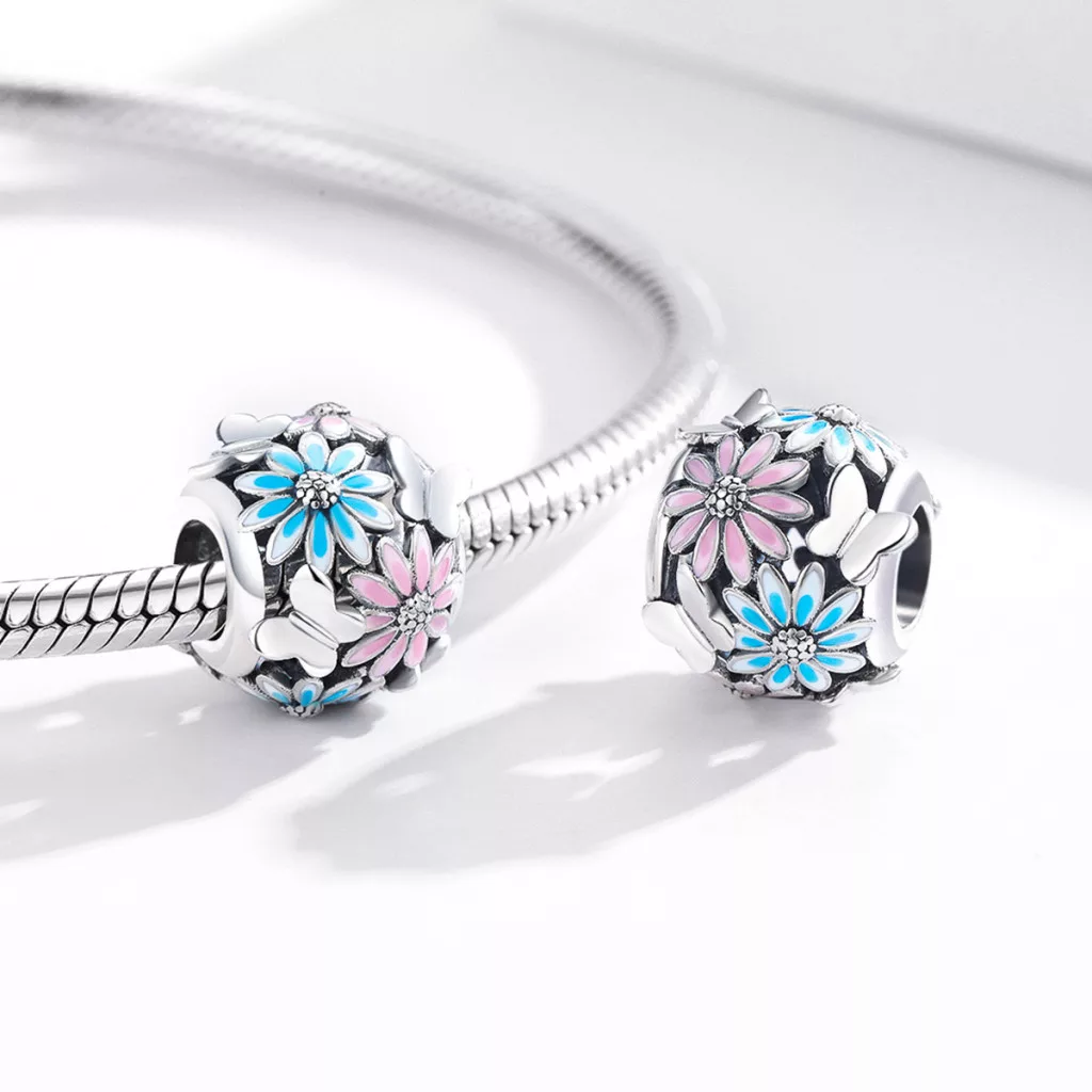 A charm alapját adó ezüstöt finom oxidációval tették még karakteresebbé, így a rajta virágzó, élénk színű százszorszépek valósággal életre kelnek. A vidám rózsaszín és a derűs kék szirmokat aprólékos tűzzománc technikával vitték fel a felületre, mely tartós és ragyogó színeket biztosít. A színes virágok között megbújó fehér bimbók teszik teljessé a kompozíciót, egy bájos és részletgazdag ékszert alkotva.