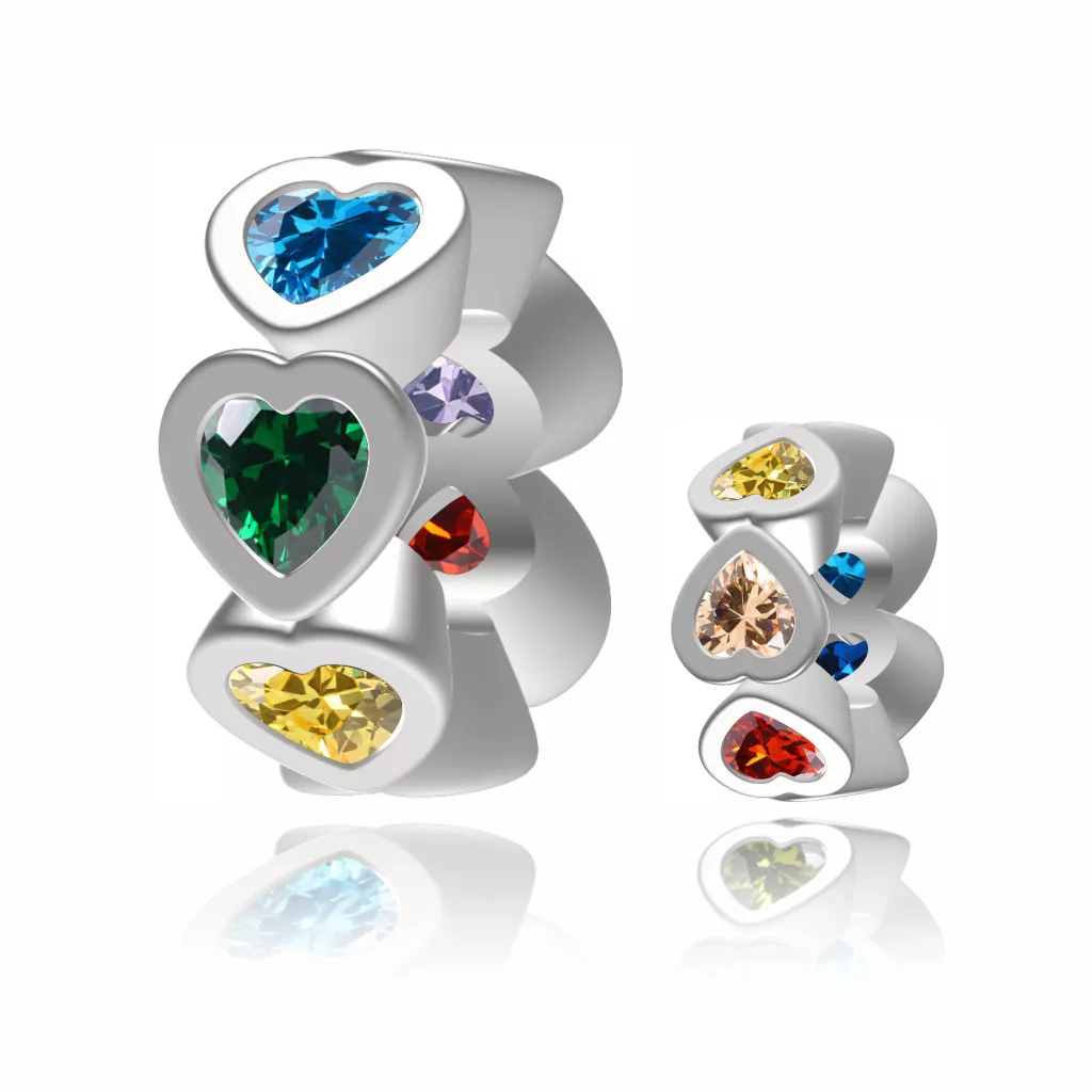 Ez a szívbe foglalt színes köves ezüst charm egy igazán lenyűgöző és elegáns kiegészítő, amely tökéletes választás mindenki számára, aki szeretné kifejezni egyedi stílusát és szeretetét. A charm egy kör alakú medálon elhelyezett sok színes szív alakú kövekkel díszített dizájnt ábrázol, amely különleges megjelenést kölcsönöz az ékszernek.