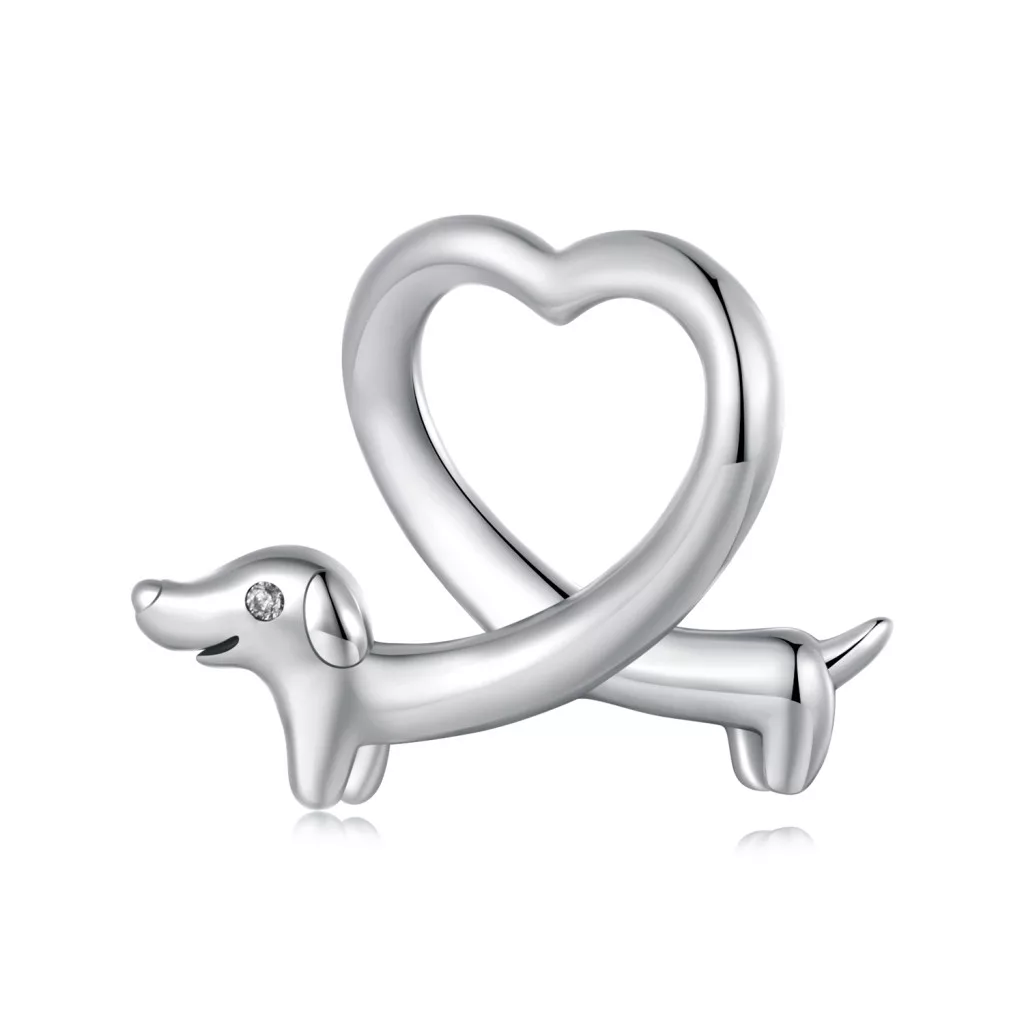 Ez a szívmelengető, ezüst charm egy tacskó sziluettjét és a szeretet szimbólumát ötvözi, ami tökéletes választás minden kutyaimádónak! A charm egy játékos, hosszú testű tacskót ábrázol, akinek a teste egy elegáns szív formájába kanyarodik. Ez a dizájn a hűséget és az örömteli pillanatokat szimbolizálja, melyeket a négylábú barátok hoznak az életünkbe.